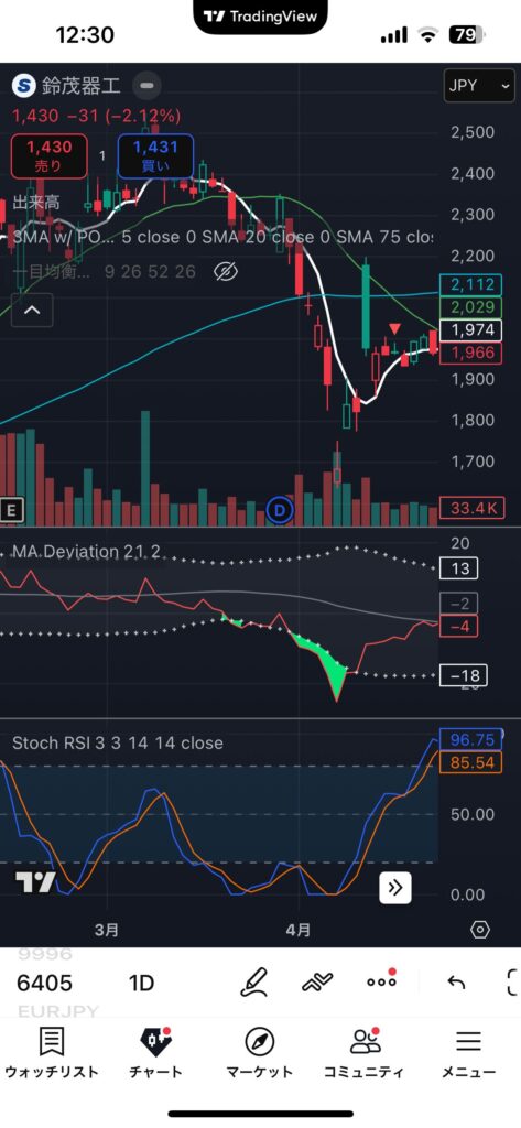 • 日足でMA-Deviationで下限赤字になった銘柄